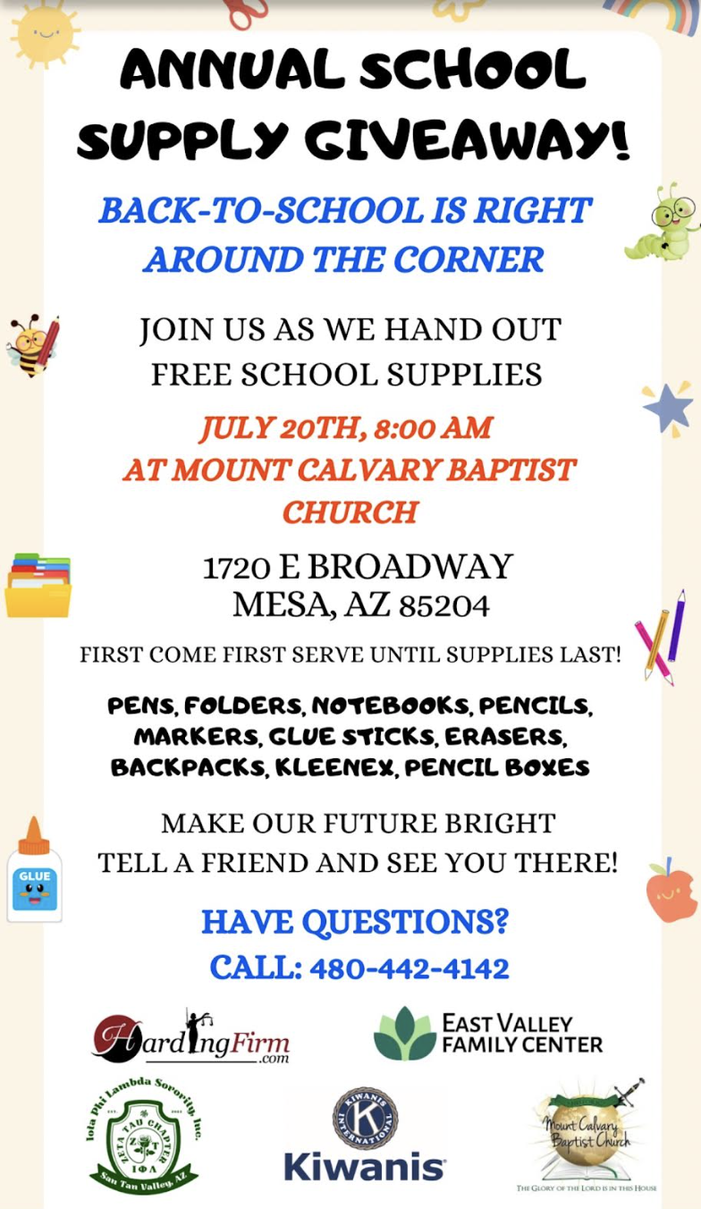 Also, please share the flyer. if you know of anyone who may need school supplies. The giveaway is July 20th beginning at 8:00 am. Be early. If you have questions, please contact 480-442-4142.
